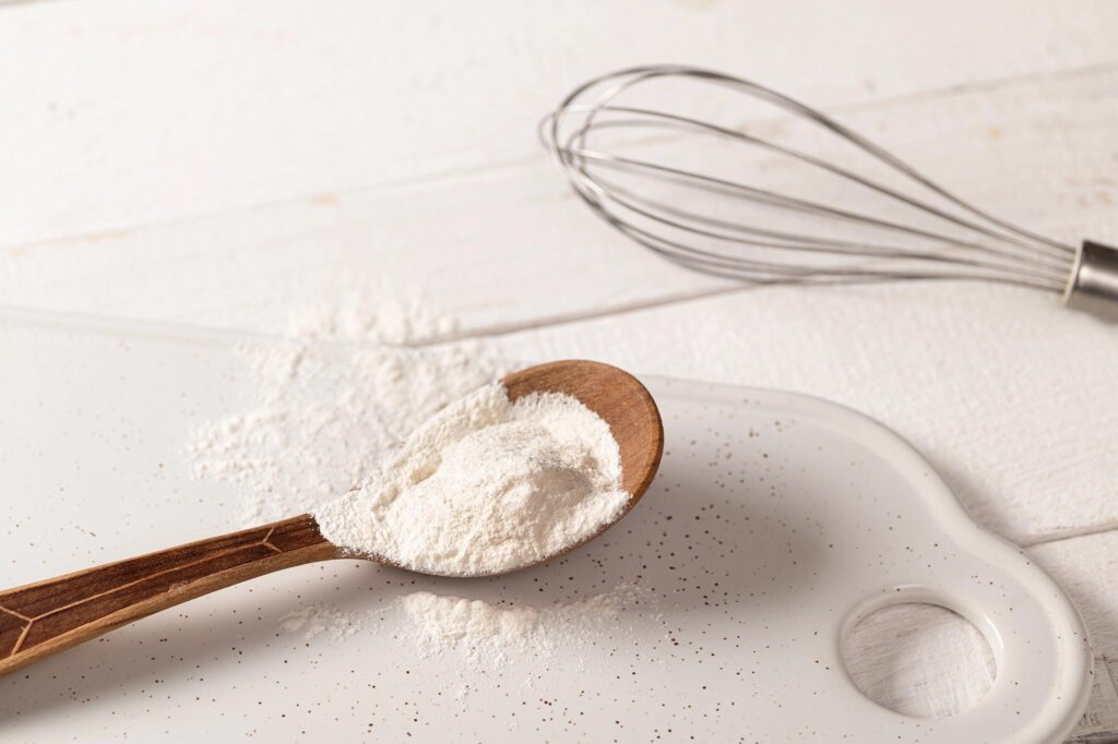 xanthan gum food additive for dough on white plate in wooden spoon with metal whisk