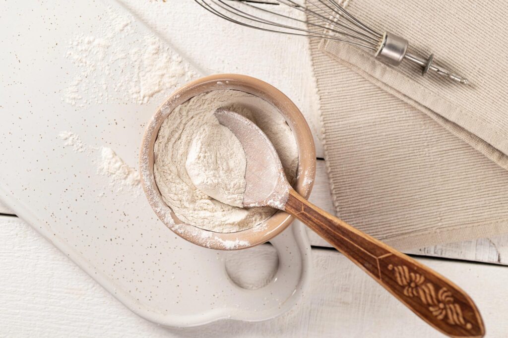 Crumbly xanthan gum in a wooden spoon. Natural thickening agent used in cooking.